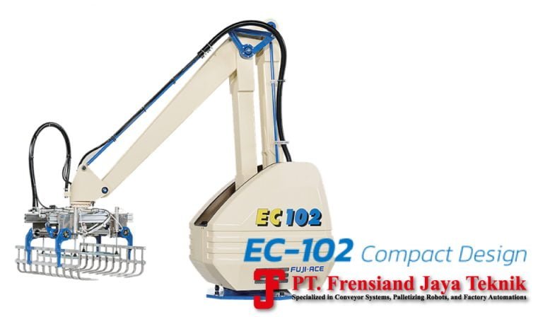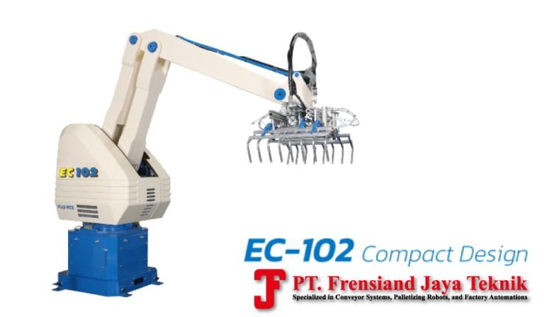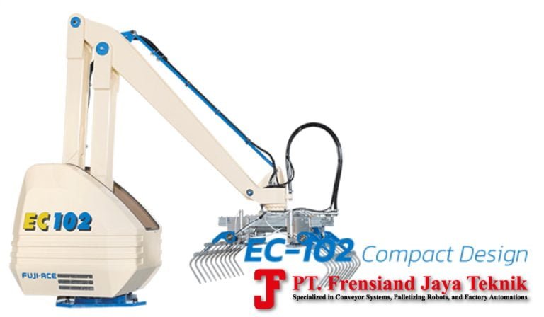 The EC-102 model is one of our most energy-efficient robotic palletizers as it uses only 3.5 kVA. Given the cycle rate-to-power ratio, it provides the most cost-effective, technically capable solution for moderate production throughput lines.